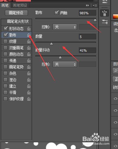 打开属性面板,选择形状动态,调整大小抖动为80左右。