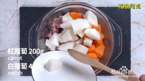 把梅花肉、红萝卜和白萝卜倒在康宁锅中。