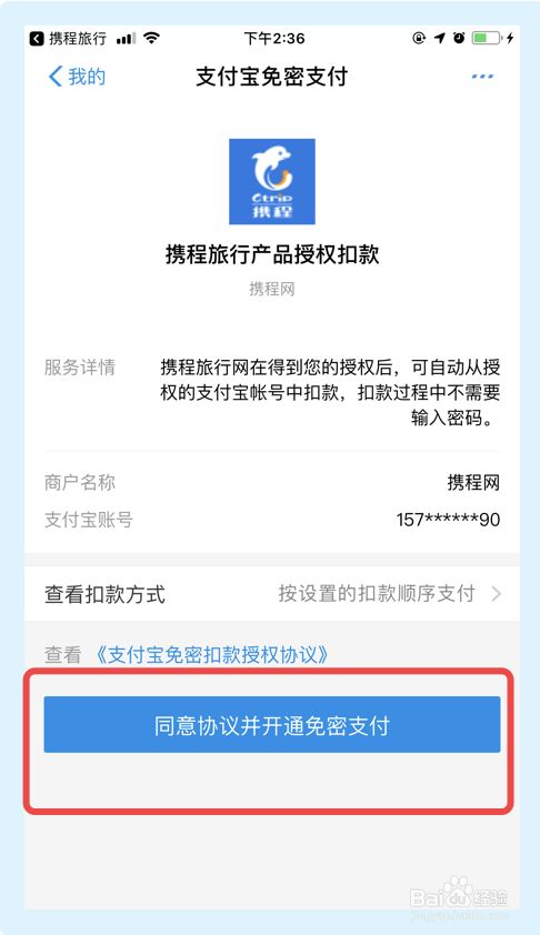 6.在接下来的界面,选择并点击【同意协议并开通免密支付】选项,完成以上步骤携程旅行app即可开启支付宝免密支付功能。