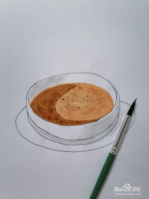 用赭石水彩涂一遍芝麻汤,再用熟褐色覆盖