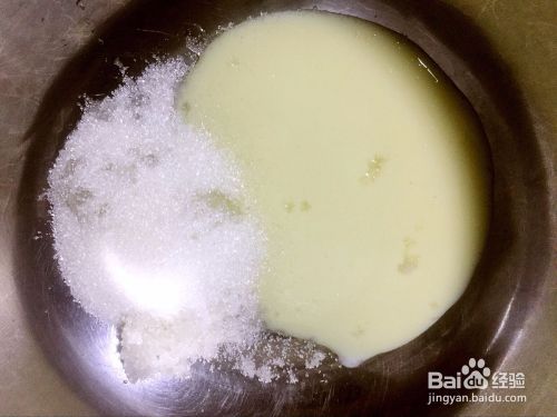 在盆里放入炼乳和白糖,用打蛋器将炼乳和白糖打发。