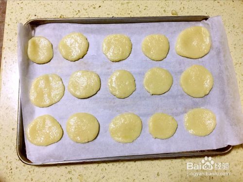 将烤箱160度预热10分钟,之后将烤盘铺上料理纸,将裱花袋挤出圆形的小团,然后如下图将小团压扁。