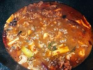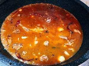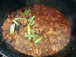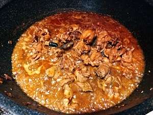 加入鸡块,将水分烧干(锅底都是油在冒泡泡);再加入老抽1小勺+蚝油1甩+火锅底料15克,翻炒均匀