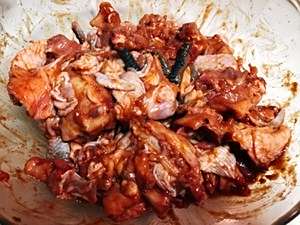 和酱料一起腌制40分钟(900克鸡块用100克酱料)