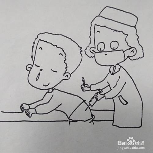 再画出医生的两只手,一只手正在打针,一只手拿着棉签
