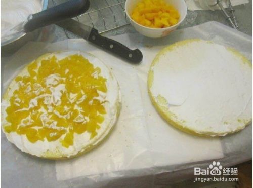 蛋糕片上抹上奶油 再放入水果 再盖上蛋糕片