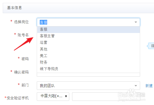 验证身份后,在新建此账号界面输入账号的基本信息,比如选择岗位、账户名、密码等。