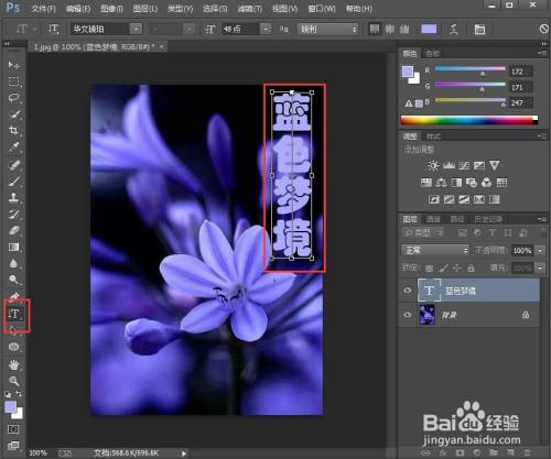 点击文字工具,将文字颜色设为蓝色,输入蓝色梦境;