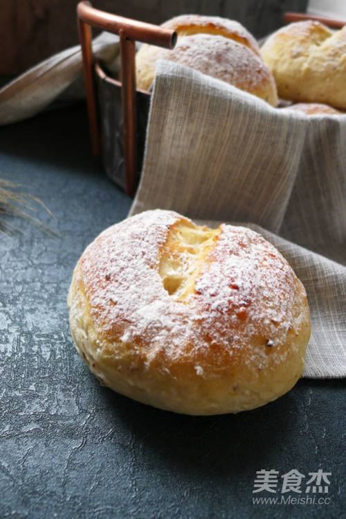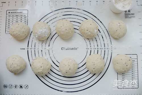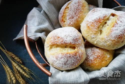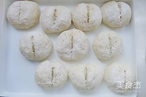 8放入带发酵功能的烤箱发酵40分钟后,在面包表面均匀筛上面粉