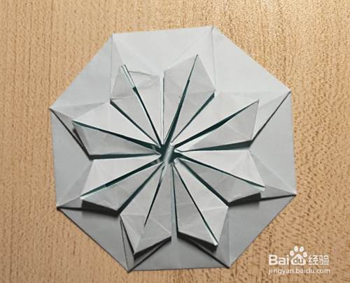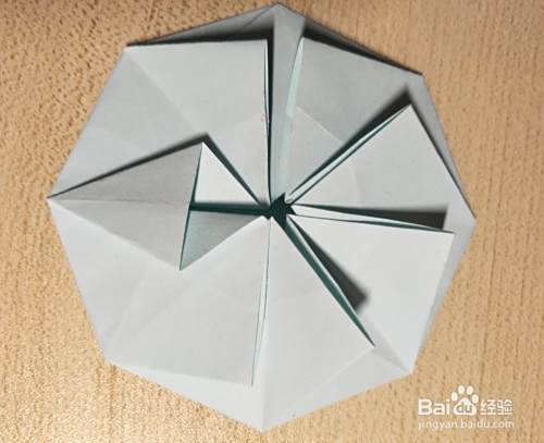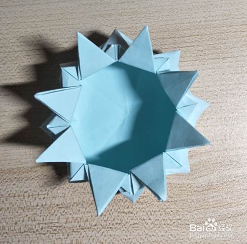 从中间将折纸撑开整形,一个芒星盒子就折好了.(由于灯光问题,照片有色差)