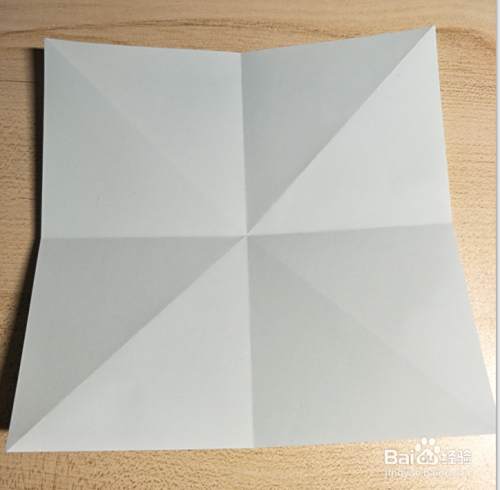 将每个角都折向中心点,压出折痕后展开,如图所示: