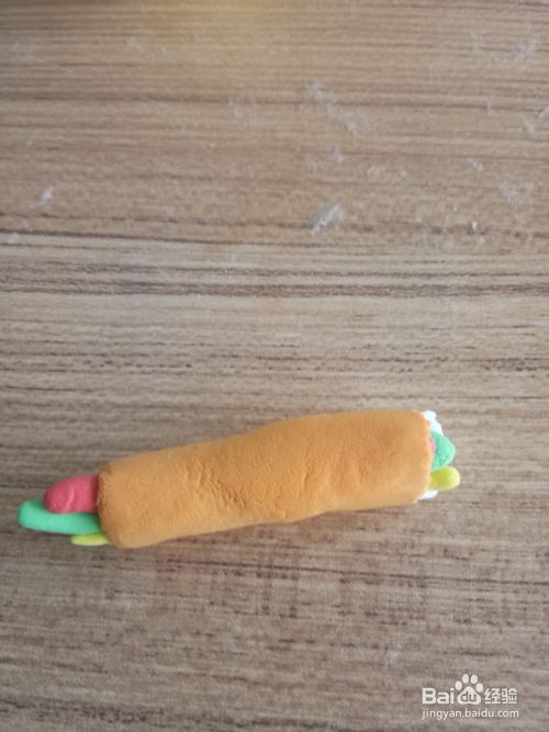 最后,再用绿色的彩泥裹一层,这样,这个蔬菜卷就做好了。