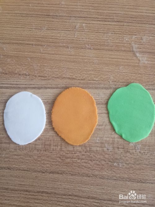 取出适量白色、橙色和绿色彩泥,搓成圆球,然后压成饼状。