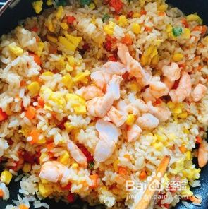加入炒熟的鸡蛋,虾仁,混合翻炒一分钟左右