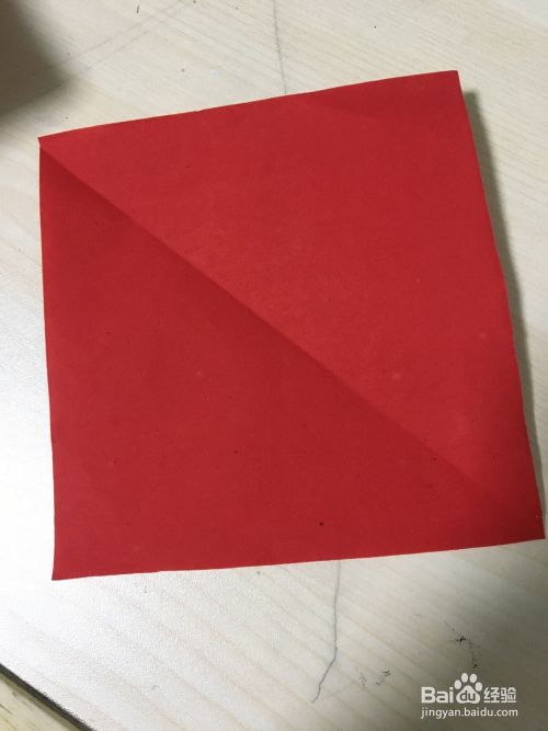 取一张正方形红色纸两角对折好,在上面写上春字的一半。