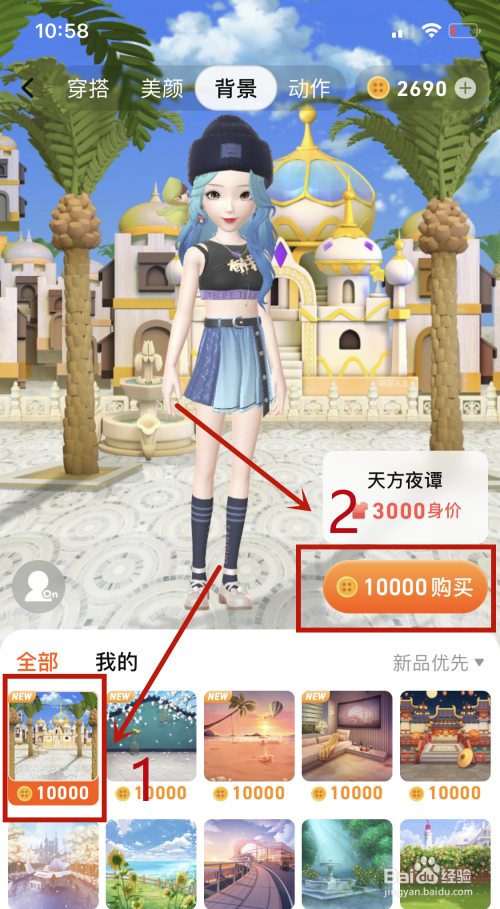 在背景页面,找到选择NEW背景【天方夜谭】后,点击右侧【纽扣10000购买】;