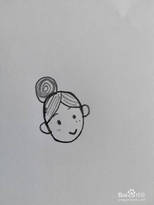 首先 我们画上 一个小女孩的 头部 上面有一个丸子 画上耳朵 五官