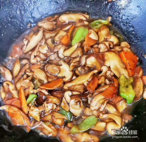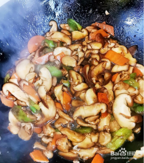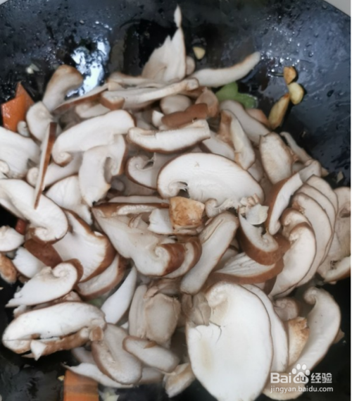 香菇放入锅中炒软。