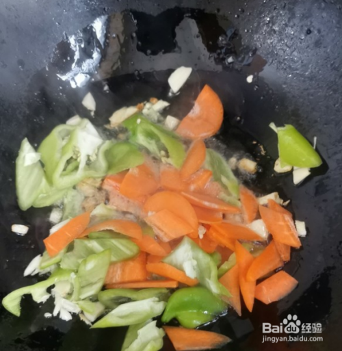 锅中热油放入大蒜炒香,再倒入青椒,胡萝卜翻炒片刻。