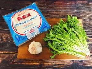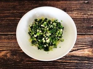 将焯熟挤水的苦苣切碎,蒜切成蒜末,加盐拌匀成春卷馅(我比较喜欢清香的原汁原味,所以只加了盐,大家也可以根据自己喜欢的口味加入鸡精等调味料)。