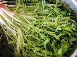 取一盆清水,放少许盐和少许食用碱面搅匀,放入苦苣浸泡一到两分钟(这种方法有利于去除蔬菜中残留的农药和细菌),取出用清水洗净备用。(步骤2的盐和碱不包含在配料中)