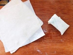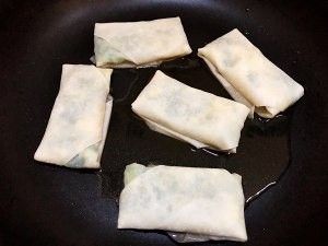 用春卷皮把馅包成大约长6厘米宽3厘米的春卷。