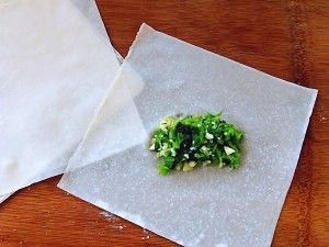 取适量馅放入春卷皮中间,用筷子或小勺略整理成长方形。