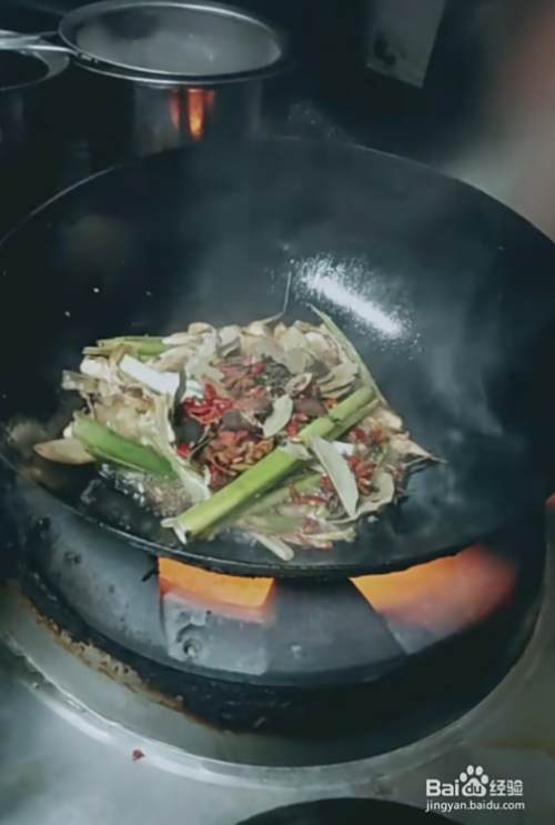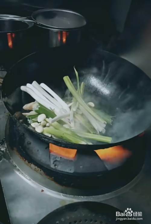 5,再次起锅烧油,倒入葱、姜、蒜翻炒几遍。