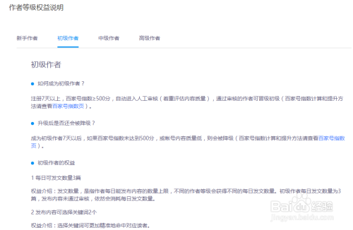点击右上角的新手作者,点击之后,进入各类作者的级别和升级降级要求,你会发现初级作者是需要500指数才能升级的。