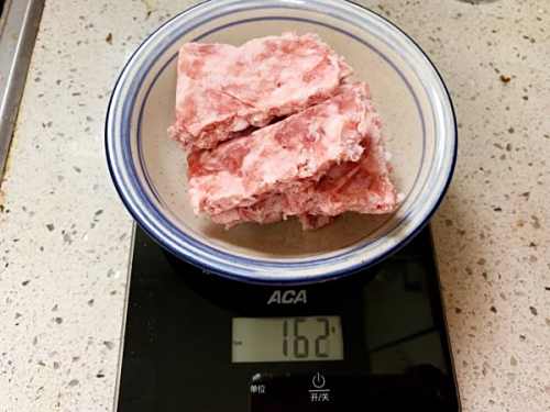 2提前剁好的肉末,称出备用。有空的时候可以剁好,冷冻起来,随吃随取