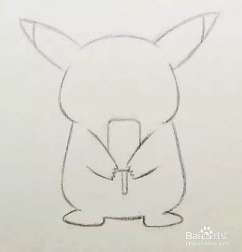 第四步:在皮卡丘的小脸蛋下面再画一个大“( )”括号,然后把小脚丫也画出来。