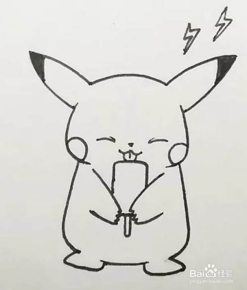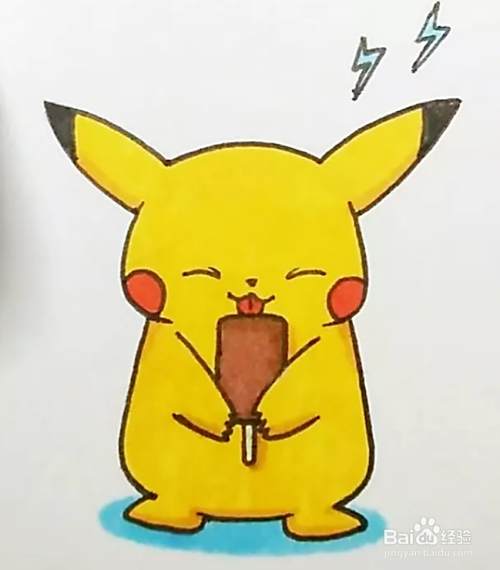红色马克笔涂脸蛋和舌头, 咖色涂雪糕、蓝色涂阴影和闪电,大功告成、漂亮又可爱的皮卡丘就画好了,是不是很简单,学会了没有?