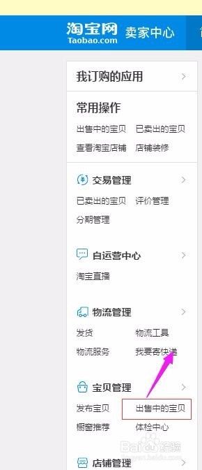 先进入自己店铺的卖家中心-点击 出售中的宝贝(在 宝贝管理 栏目里)