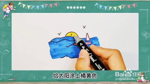 在天空上面画几只海鸥,用倒写的人字形下面画一个短横一,再画一个太阳,从海平面慢慢升起,最后给大海涂上蓝颜色,给小帆船涂上粉红色,给太阳涂上橘黄色,这样大海就画好啦。