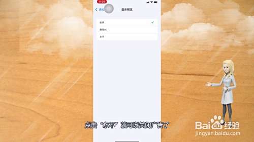 在显示预览界面中,点击“永不”就可以关闭广告了。