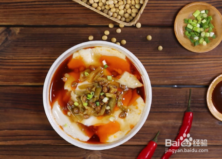 锅中坐清水 30ml 左右,加入盐、鸡 4 精、酱油、开火后放入水淀粉,待 变稠即可。豆花凉透后,用勺子将 其舀到一个小碗中,放入黄豆、葱花丁、榨菜丁、芡汁、红油即可。