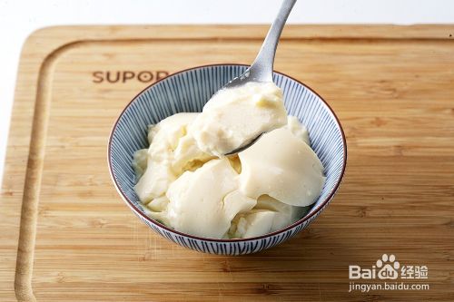葡萄糖酸内酯按照 1:4 的比例,加 入 5g 左右的清水,变成凝固汁。豆 浆在制作好之后,过筛,取大约 500ml 左右的鲜豆浆倒入一个器皿 内,之后趁热立即点入凝固汁,边 倒边搅拌,一共大约搅拌 10 下左右 即可。
