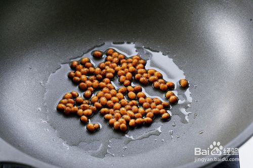 在等豆花凝固的过程中来制作炸黄 豆。锅中坐油,大约 15ml 左右,放 入干黄豆,中火煎炸,直到黄豆变 成焦黄酥脆即可。
