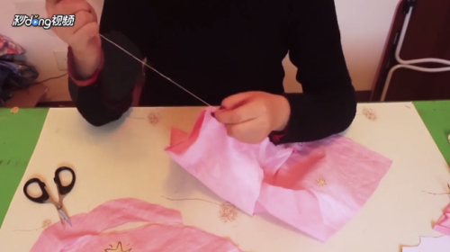4把裁剪好的裙子的布片缝合,先缝上身再裙摆,需要折叠缝进去的部分折进后再缝线。