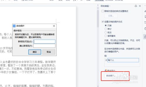 最后点击“启动保护”,设置密码即可将文档保护起来,限制他人编辑文档