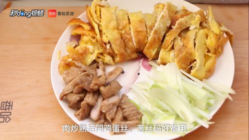 17肉炒熟后同鸡蛋丝 、葱丝码好备用。