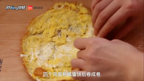 14四个鸡蛋剪成蛋饼后卷成卷。