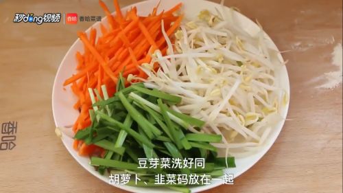 20豆芽菜洗好同胡萝卜 、韭菜放在一起码好。
