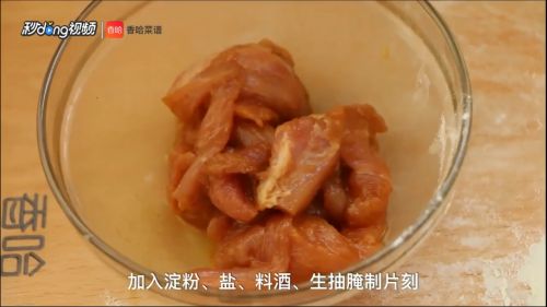 13加入淀粉 、料酒 、盐 、生抽腌制片刻。