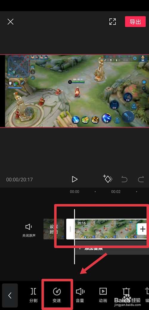 完成视频文件添加后,我们在创作页面点击选中创作栏的视频,点中后会在底部弹出功能项,我们点击进入变速功能;