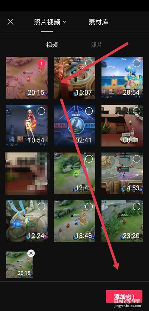 进入创作页面后,会读取本地相册,我们选中并添加需要制作的视频或者图片;