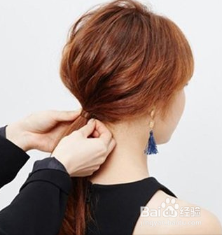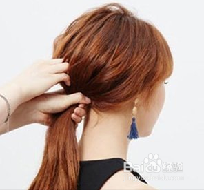 step3:长发扎成低马尾辫之后,左右握在扎发位置,右手将后脑位置的头发向外拉蓬松,让其看起来更加的饱满有随意感。如图所示。
