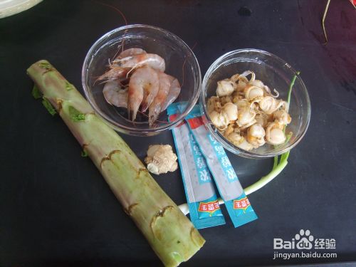 准备所需材料,虾洗净去虾线和内脏,鲜贝洗去肠脏。