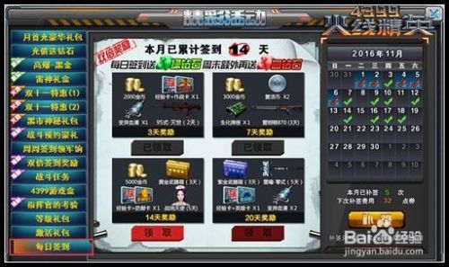 大家可以下载4399游戏盒,进行每日签到,签到第1、5、14、25天都可以获得指定的武器和道具,每个月的奖励都是不一样的哦!