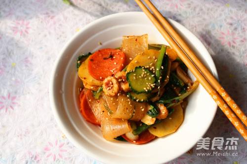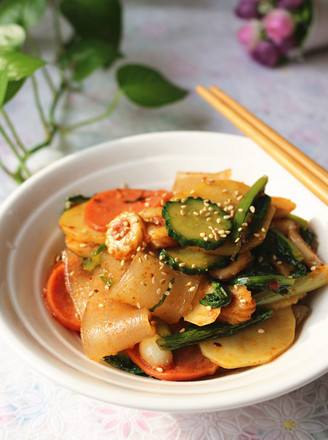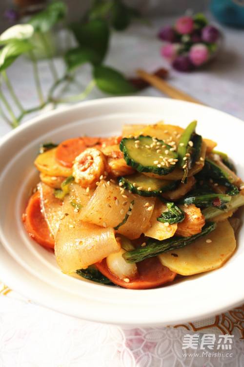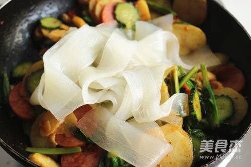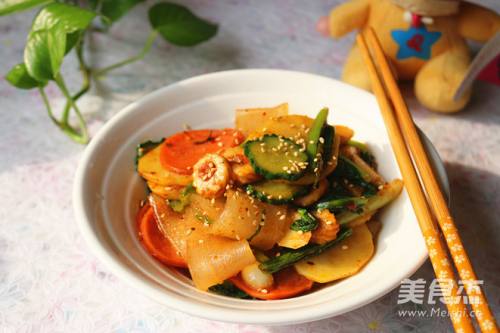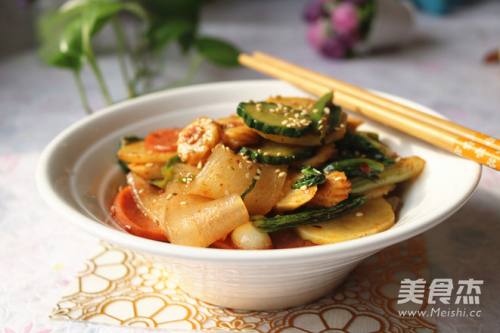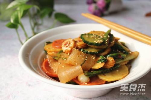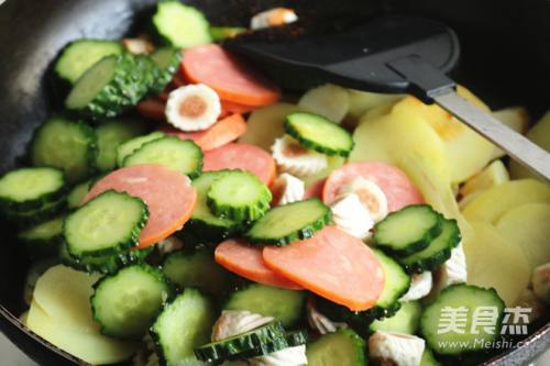 8加入各种片片们,炒匀,不需要炒太久,黄瓜炒久了就出水不好吃了。